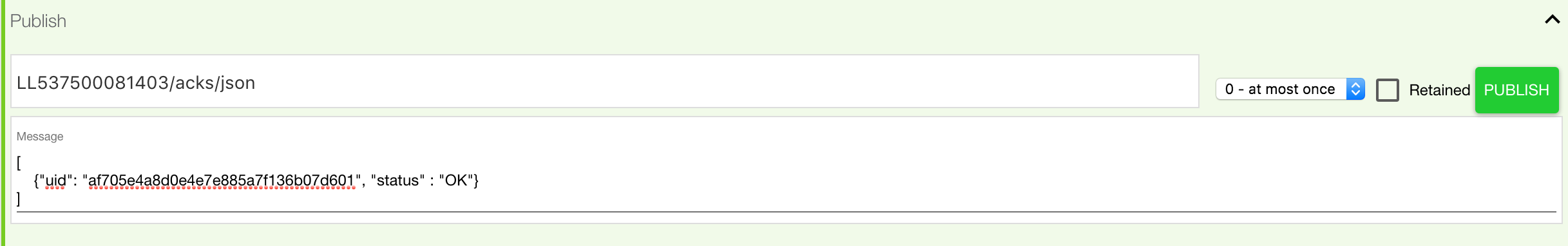 Send back the operation uid provided in the command to acknowledge it and update the status Failed or Success in AirVantage. In the publish section: