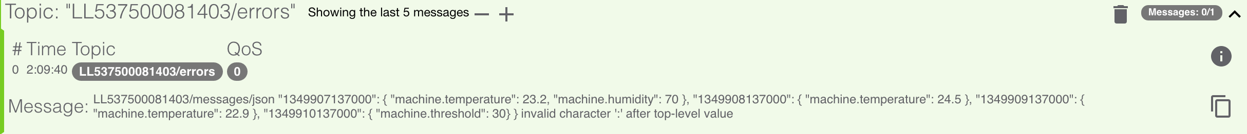 To receive notifications when AirVantage cannot understand the payload sent, AirVantage provides a topic you can subscribe to. As an example showing what happens when you send a bad paylod, you can try to publish the following payload with a missing } char at the beginning of the message :