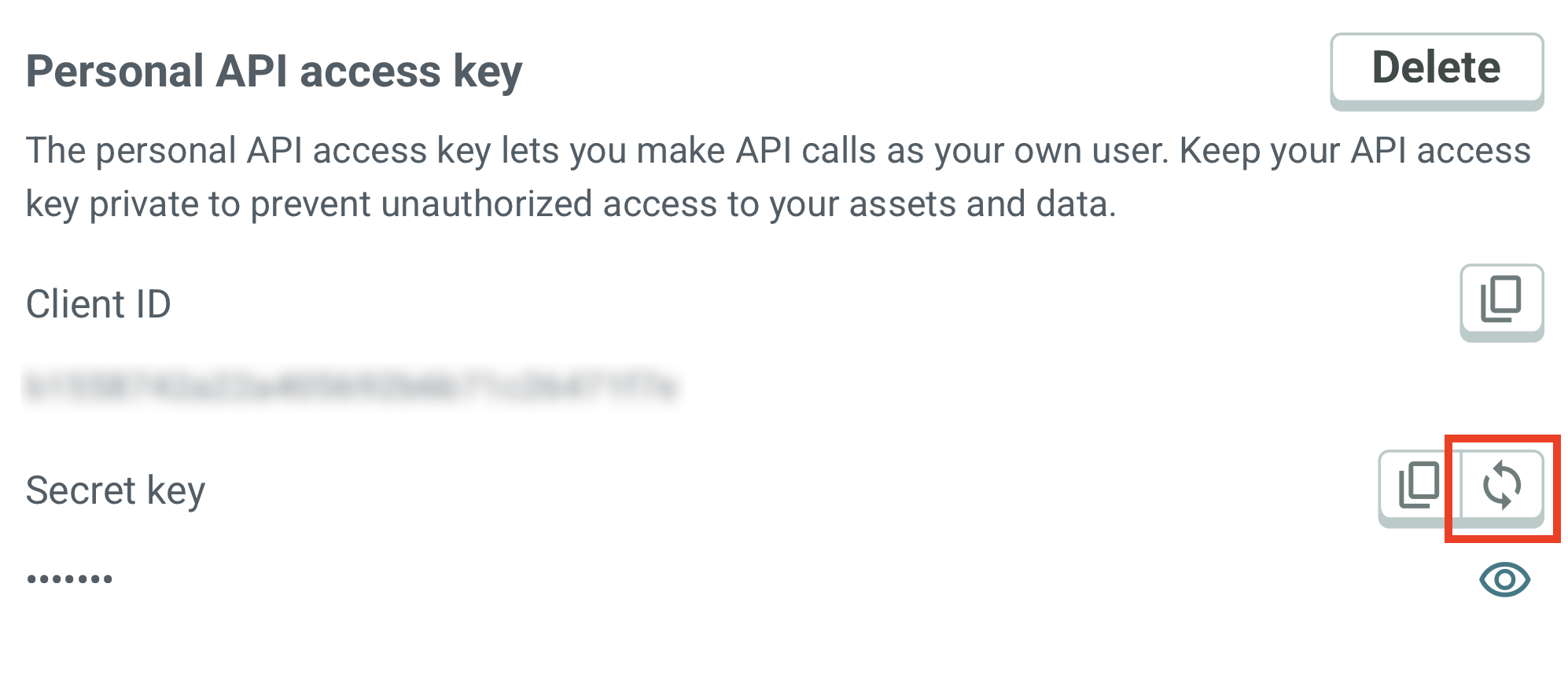 In the Personal API access key section, click Delete. A prompt will be displayed to confirm whether you want to delete the personal API access key.