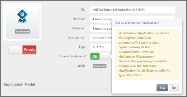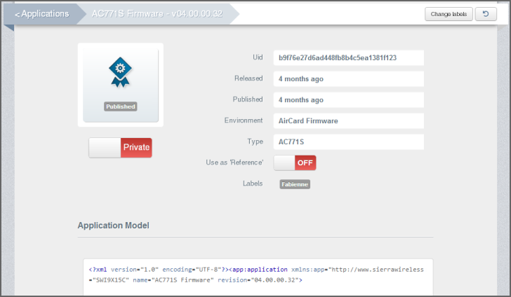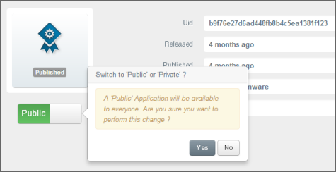 Application details can be be reviewed in a dedicated page accessible from the My Apps section. This is also where you can set the application as a public or private and as a reference application.