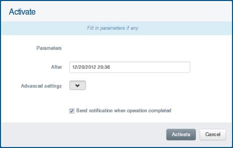 - Click on Activate (in action bar after selecting the subscription or directly in Actions column), then fill in required parameters in the Activate window which opens: