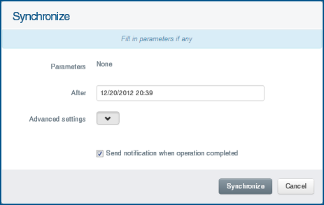 - Click on Synchronize (in action bar after selecting the subscription or directly in Actions column), then fill in the required parameters of the Synchronize window which opens: