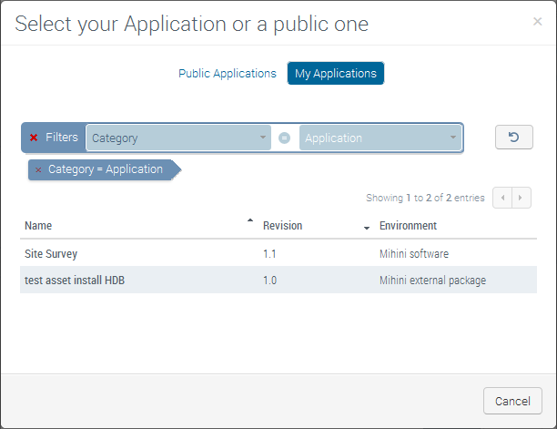 When choosing the application(s), the selector will list all public firmware and applications and allow you to select one or more. For AirLink gateways, click on the version of ALEOS that is installed on your device. Selecting a public application will automatically add it to your private repository (My Apps). If you also have an embedded application (ALEOS AF), you will also need to add it to your system in the list of applications. If your application is private, you will need to select ‘My Applications’ to search and select if from your private repository: