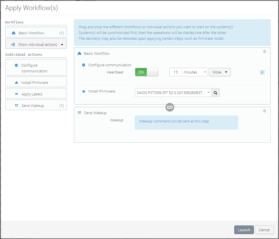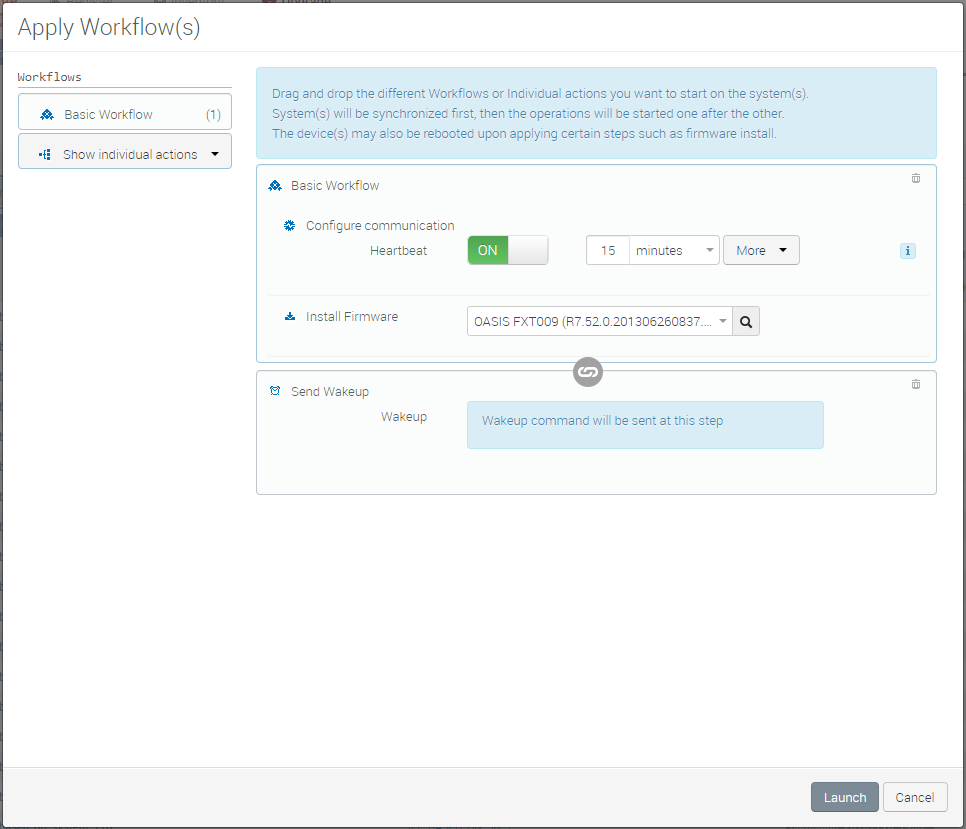 Once you click Launch and the Apply Workflow(s) process begins, the operations are executed one after another, resulting in the desired configuration. Please note that this process undertakes one operation step only at each device communication interval. The overall configuration may take few device heartbeat periods. The device will reboot one or more times during this process.