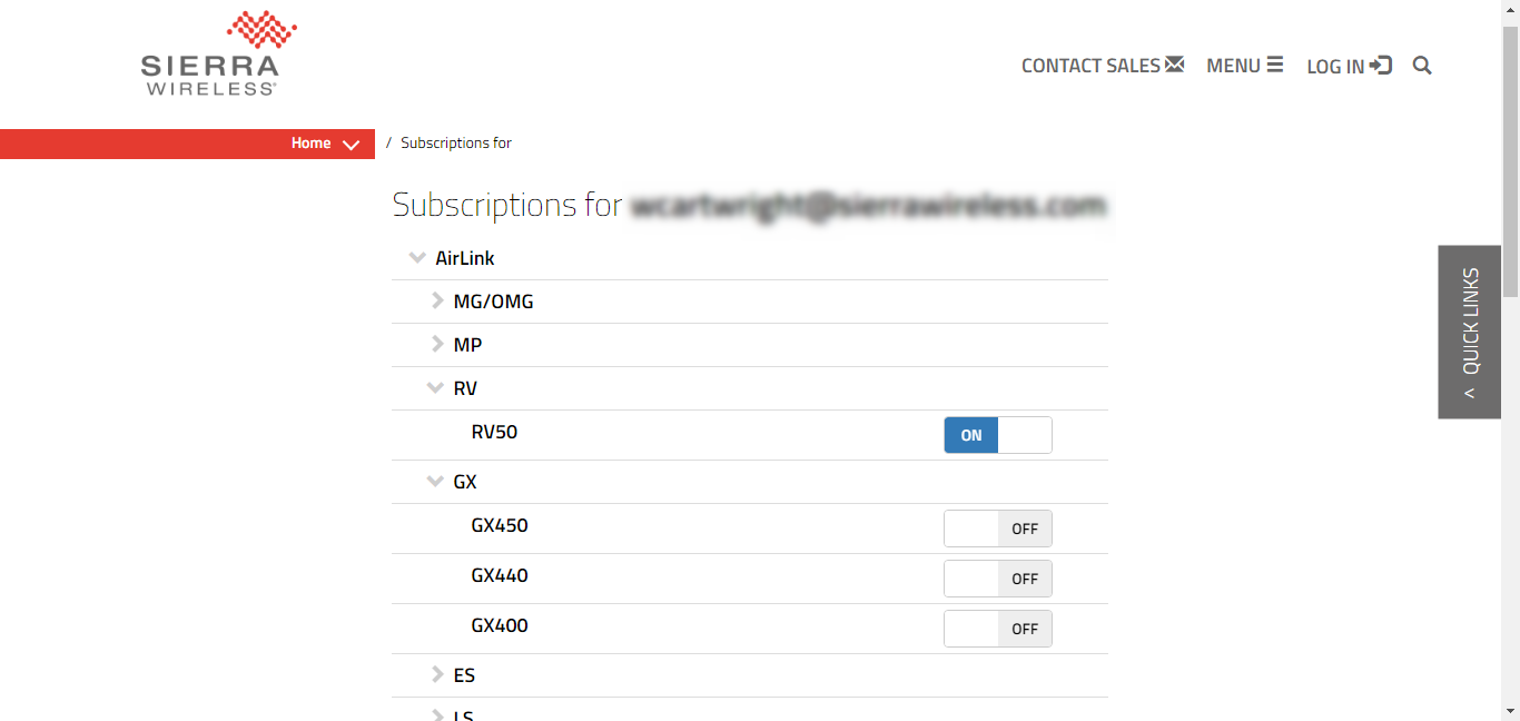Click on the type of device for which you would like to receive notifications. If you want to subsribe to GX450 Firmware updates for example, select first “AirLink”, then the GX family and finally the GX450 product itself.
