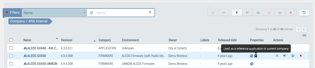 The Properties column in the My Apps table shows you which applications are used for reference firmware. The blue flag is Sierra Reference Firmware; the black flag is Company Reference firmware. By default, no Company Reference firmware is enabled. You must manually enable it.
