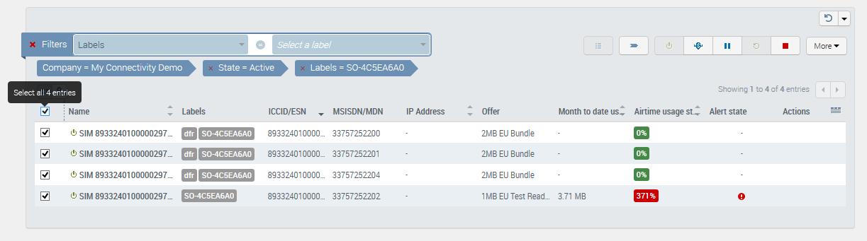They can be used for geographic regions, fleet owner, type of device in which the SIM is inserted, or any other identifier that you would like to apply and use as a search term in the future. We also apply a label with the order ID so that you can easily select all SIMs from a specific order. Systems can have an unlimited number of labels.